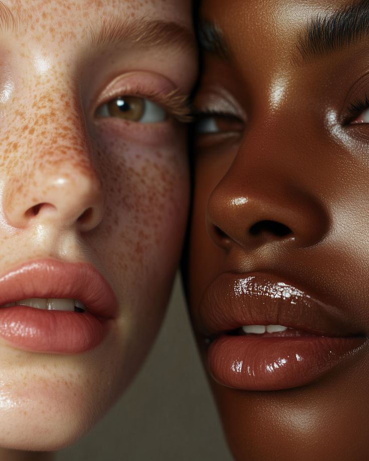 Clara, difusa e suave, ressaltando a textura da pele sem imperfeições ou exageros. A luz é pensada para criar uma estética limpa e refinada, com fundo neutro ou claro, que remete a frescor, pureza e sofisticação.